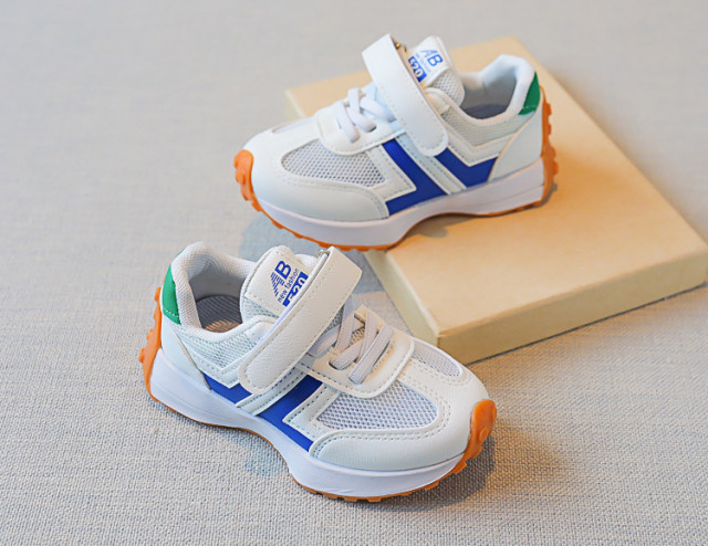 Adidasi pentru copii, din material textil cu insertie de material tip piele ecologica, se inchid cu sireturi din elastic si bareta cu arici. Sunt prevazuti cu insertii albastre in laterale.