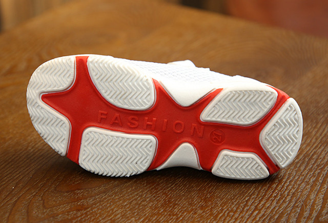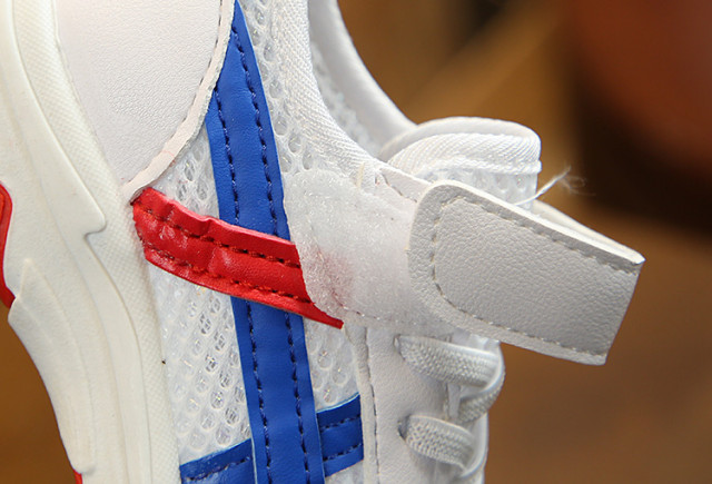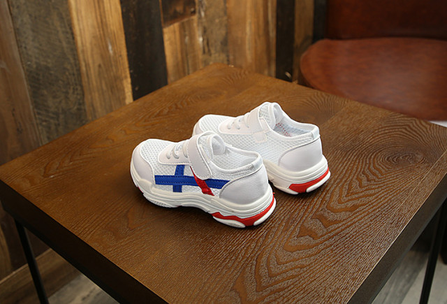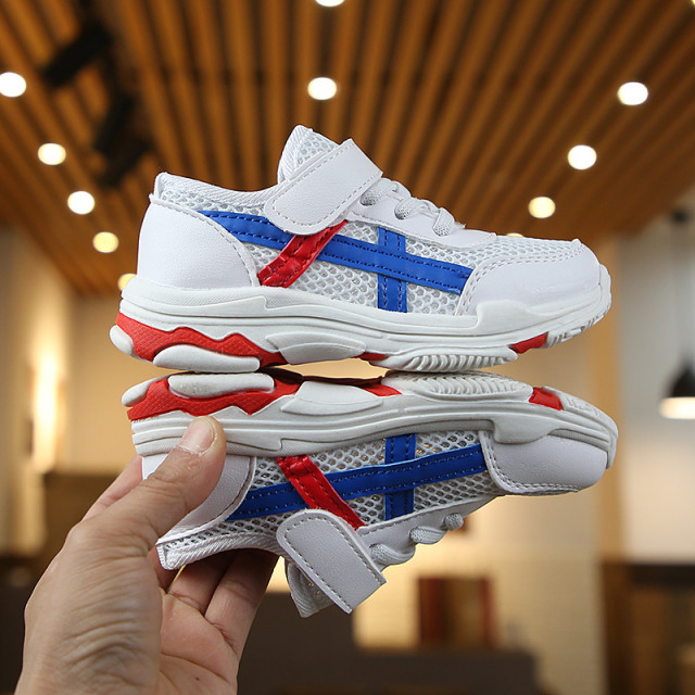 Adidasi pentru copii, din material textil tip plasa, cu dungi rosii si albastre aplicate intr-o parte.