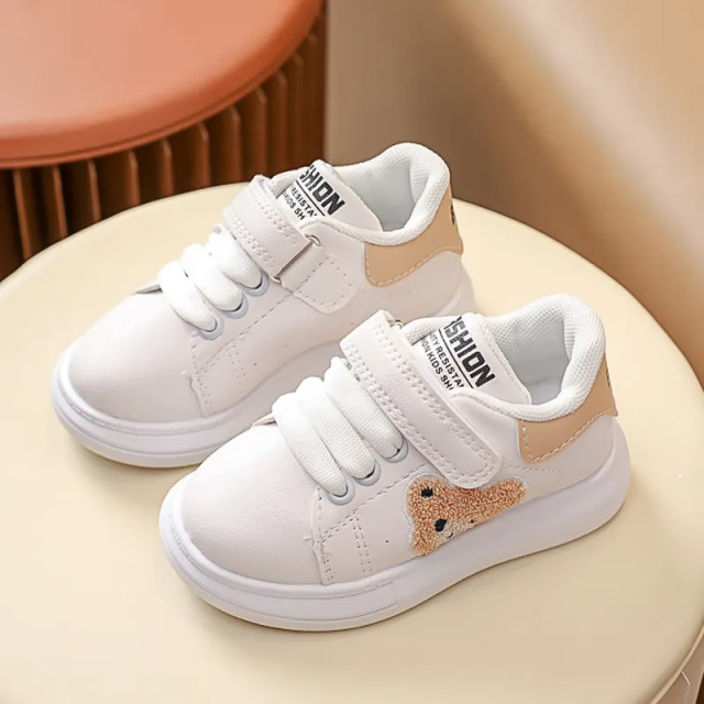 Adidasi pentru copii, din material tip piele ecologica, se inchid cu sireturi din elastic si bareta cu arici. In laterale au aplicat un ursulet crem plusat.