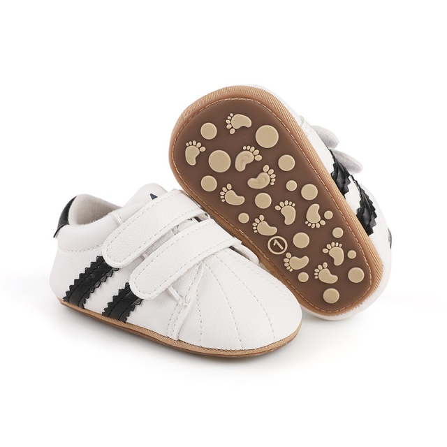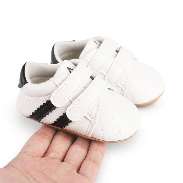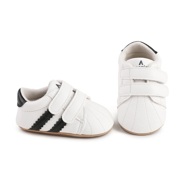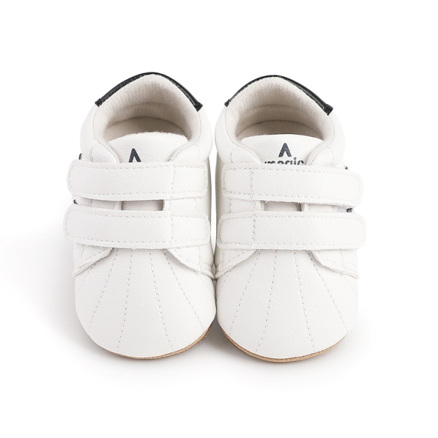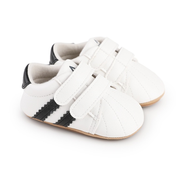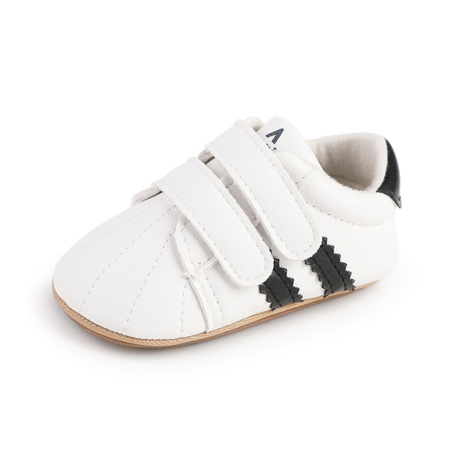 Adidasi bebelusi, din piele ecologica, de culoare alb cu detalii negre, prevazuti cu inchidere cu barete velcro pentru o fixare sigura si usoara.