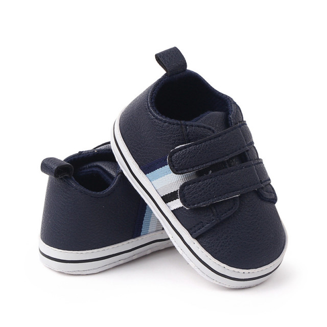 Adidasi pentru bebelusi, din material tip piele ecologica, se inchid cu barete cu arici intr-o parte. In laterala sunt prevazuti cu dungi colorate.