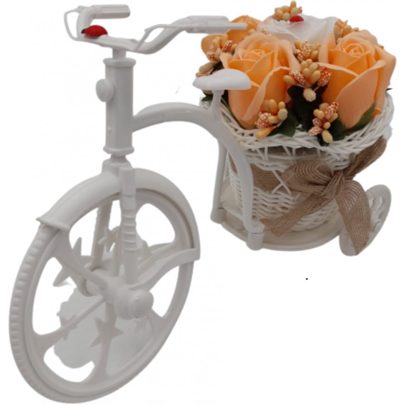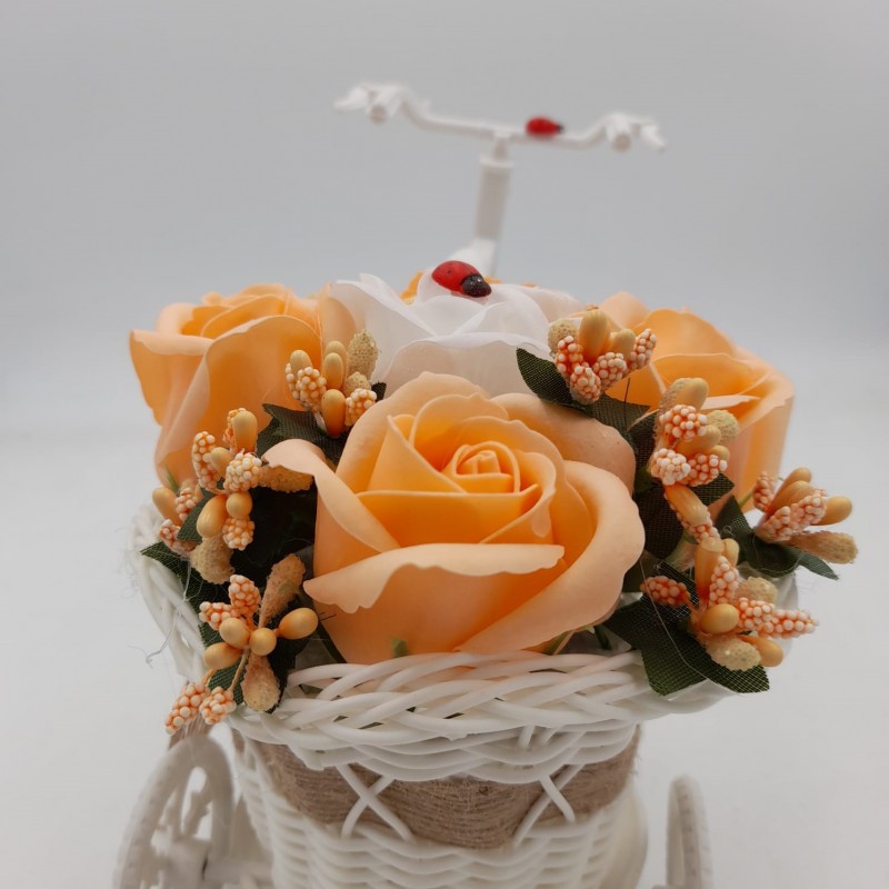 Aranjament floral, trandafiri, portocalii "bicicleta cu flori zambarete", flori de sapun, 22x15x12 cm