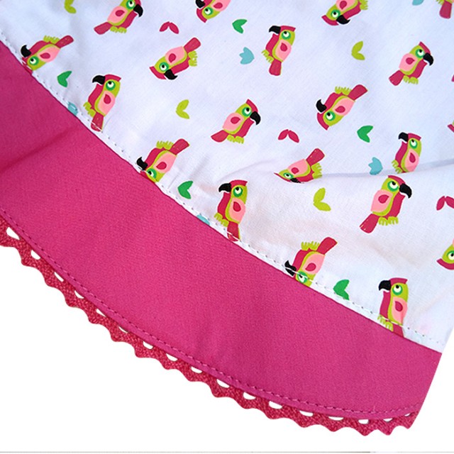 Baticut pentru fetite, din bumbac, alb, imprimat cu tucani, are bor roz-ciclamen. Are elastic la spate, se poate lega in crestet, transformandu-se in caciulita, se leaga sub barbie.