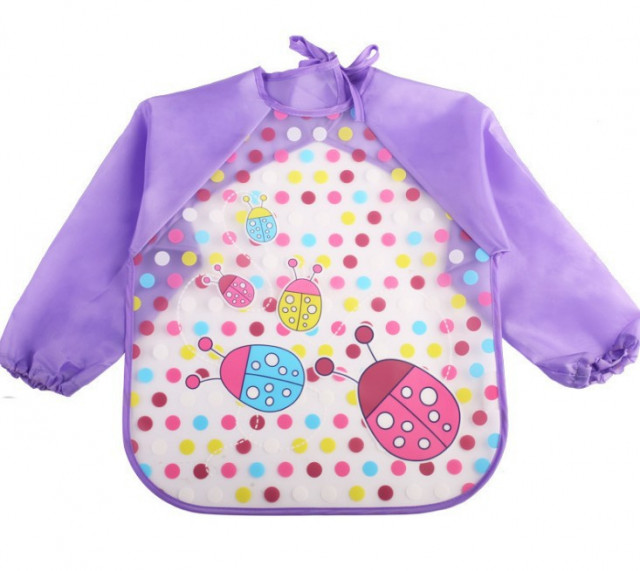 Scapa de grija hainutelor murdare. Bavetica cu manecute lungi asigura protectie fiind usor de curatat. Partea din fata este din EVA (polietilena acetat de vinil), usor de sters si totodata sigur pentru copii.