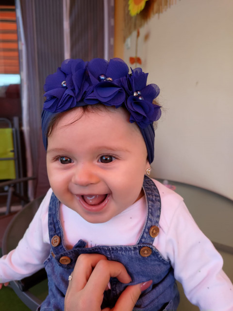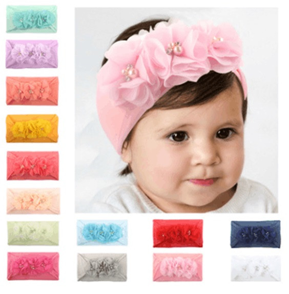 Bentita lata pentru fetite, elastica si moale cu o flori din tulle cu perlute si strasuri aplicate in fata. Este lejera pentru capul bebelusului, modelandu-se cu usurinta.