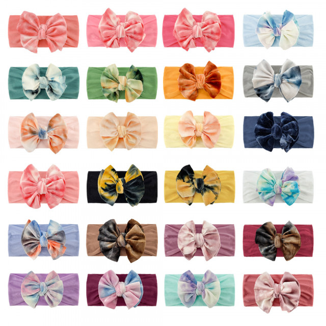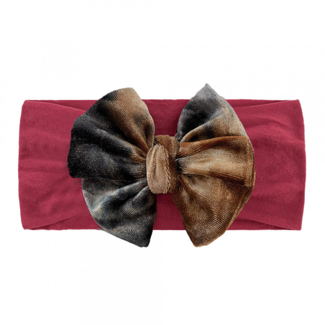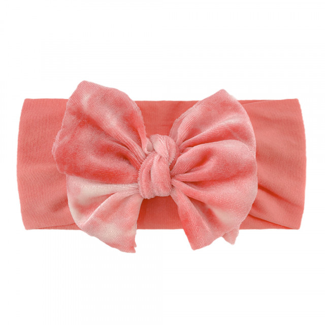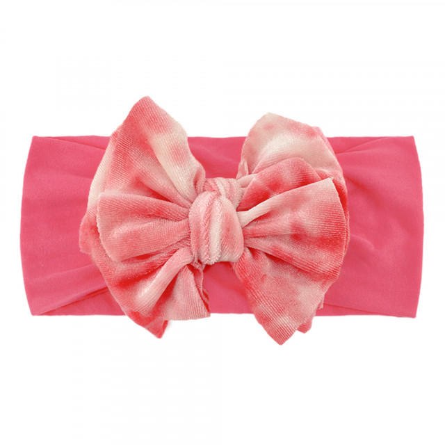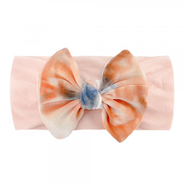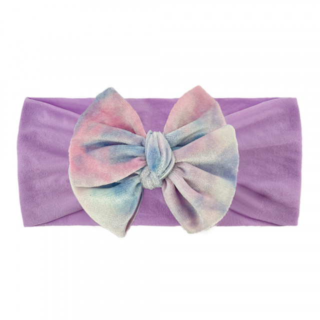 Bentita lata pentru fetite, elastica si moale cu o fundita din catifea, cu imprimeu in degrade, aplicata. Este lejera pentru capul bebelusului, modelandu-se cu usurinta.