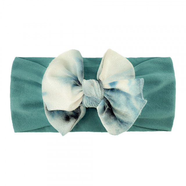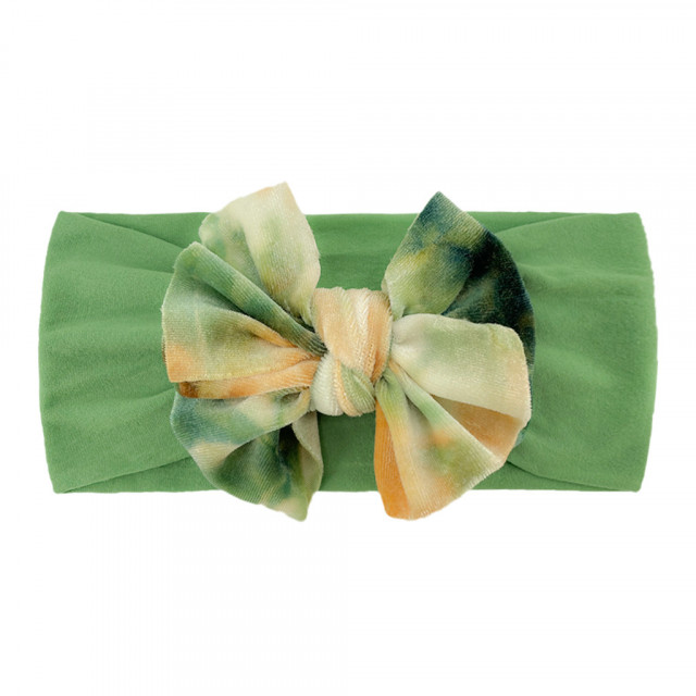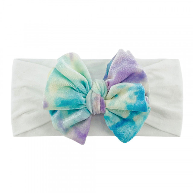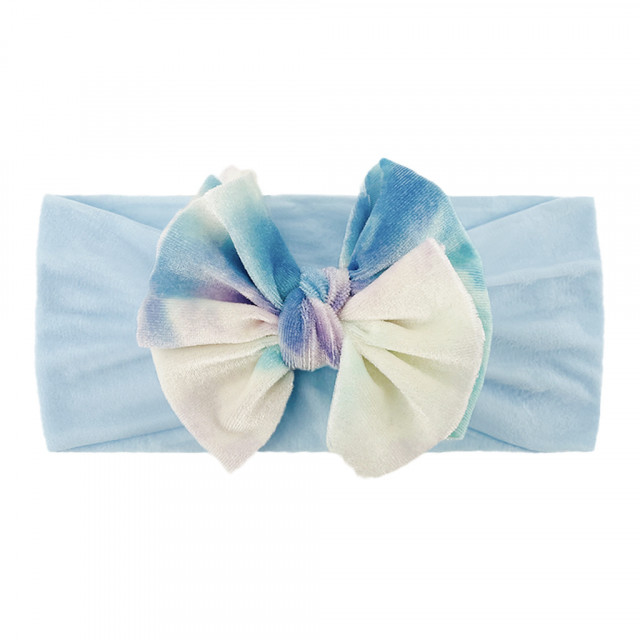 Bentita lata pentru fetite, elastica si moale cu o fundita din catifea, cu imprimeu in degrade, aplicata. Este lejera pentru capul bebelusului, modelandu-se cu usurinta.