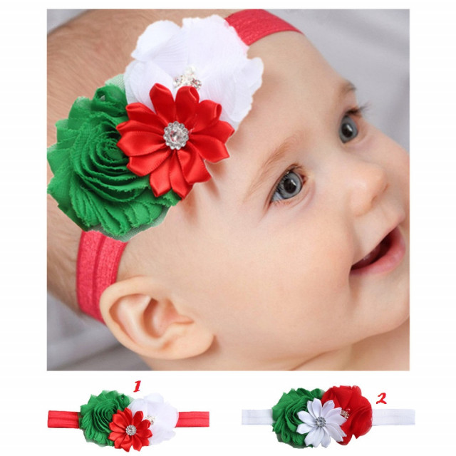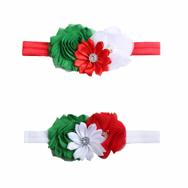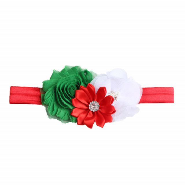 Bentita pentru fetite, din elastic moale, cu flori albe, rosii si verzi, cu strasuri si perlute.