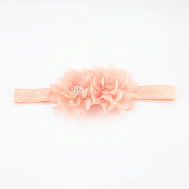 Bentita pentru fetite, cu doua floricele din tulle cu strasuri aplicate numai pe o floricica. Elasticul este lejer pentru capul bebelusului, foarte fin, modelandu-se cu usurinta.