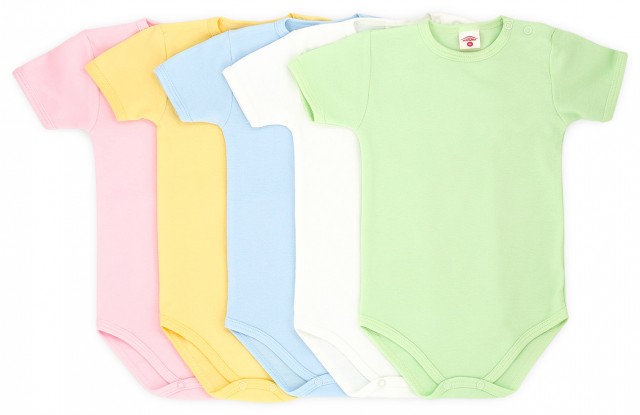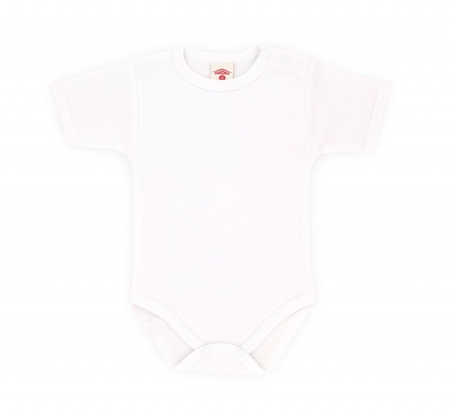 Body pentru bebelusi cu manecute scurte, (cu sau fara striatii), culoare alb. Se inchide cu capse intre picioruse si pe umar.