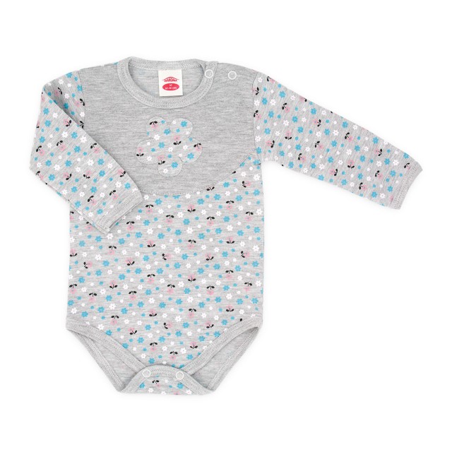 Body bebe, gri, imprimat cu floricele, are manecute lungi, se inchide cu capse pe umar.