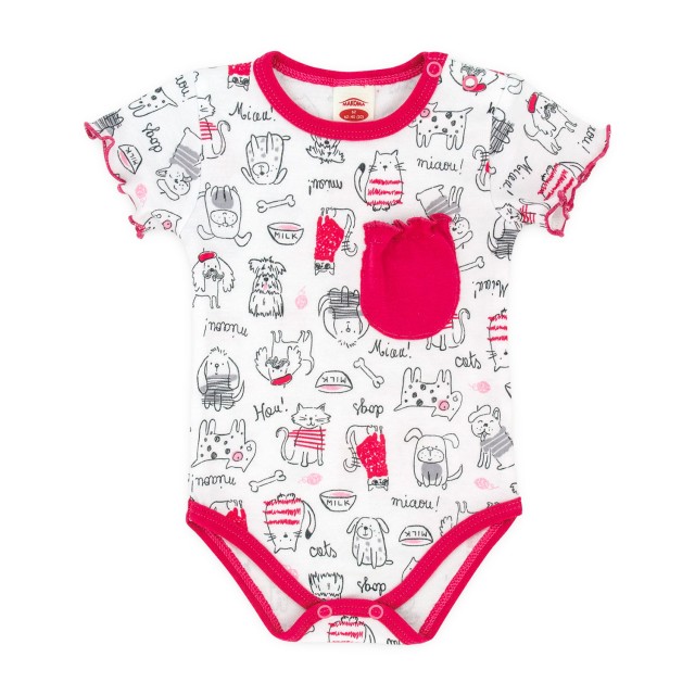Body bebe, alb, bordat cu roz-ciclamen, are manecute scurte, este imprimat cu pisicute si catelusi, se inchide cu capse pe umar.