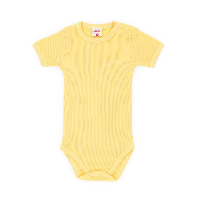 Body pentru bebelusi, culoare galben. Se inchide cu capse intre picioruse si pe umar.