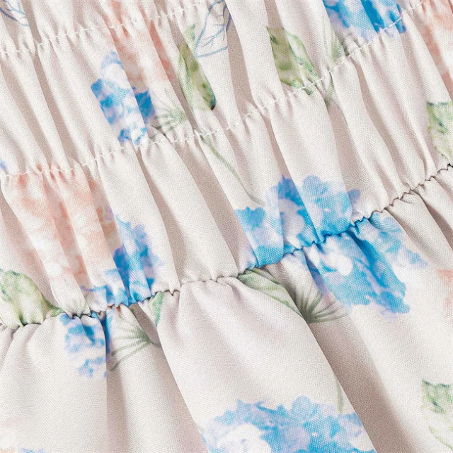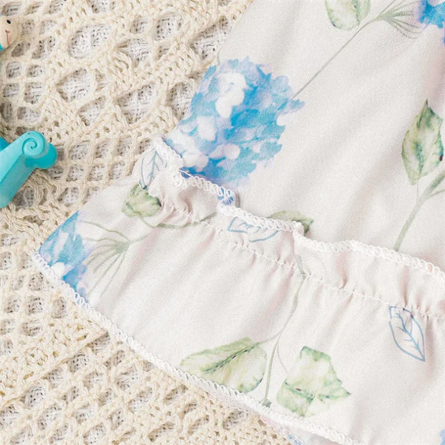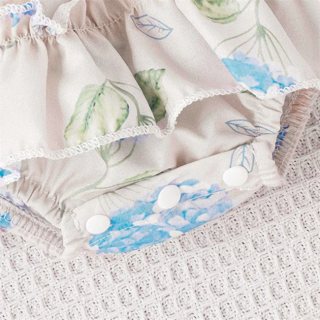 - Body roz pal, cu fustita aplicata, cu maneca scurta, imprimat cu floricele bleu si roz, se inchide cu capse intre picioruse;