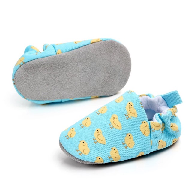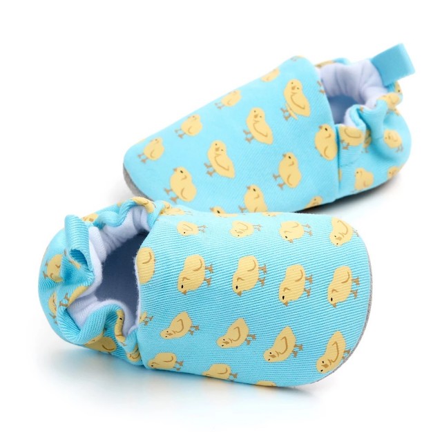 Botosei pentru bebelusi din materal textil, imprimati cu puisori galbeni. Sunt prevazuti cu elastic la spate.