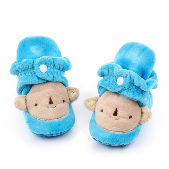 Model: botosei pentru bebelusi din material textil plusat, in forma de maimutica, sunt prevazuti cu elastic la spate, se inchid cu bareta lata cu capsa.
