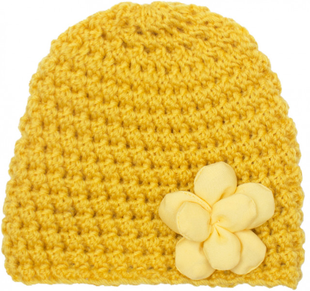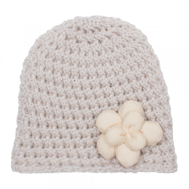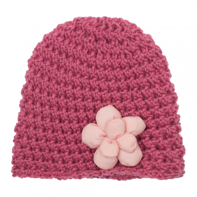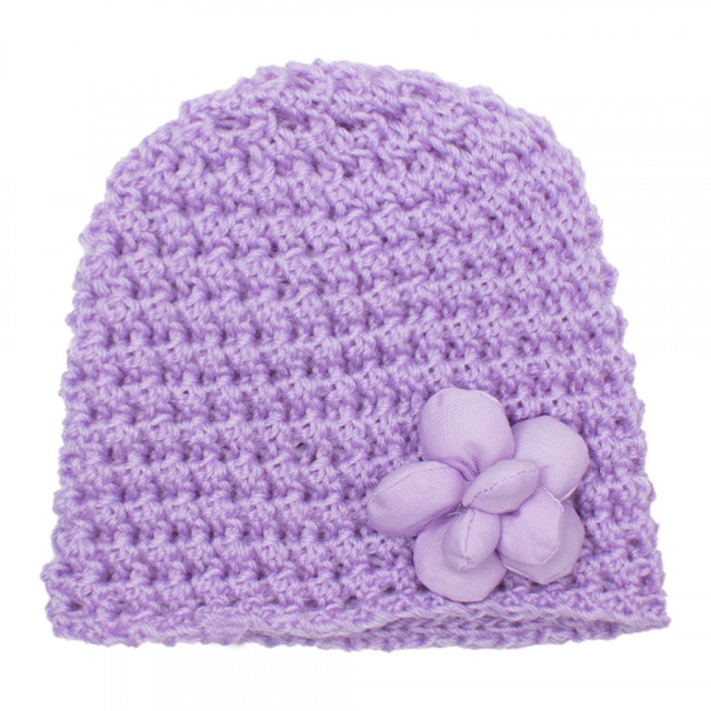 Caciulita crosetata pentru micutele domnisoare, cu o floricica aplicata intr-o parte.