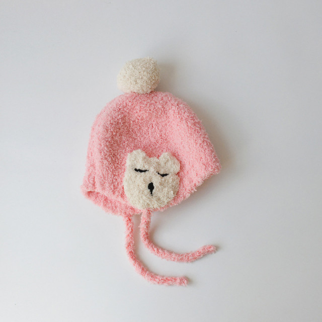 Caciulita pentru fetite, groasa, cu ursuleti aplicati in parti, prevazuta cu ciucure, se inchide cu betelii sub barbie.