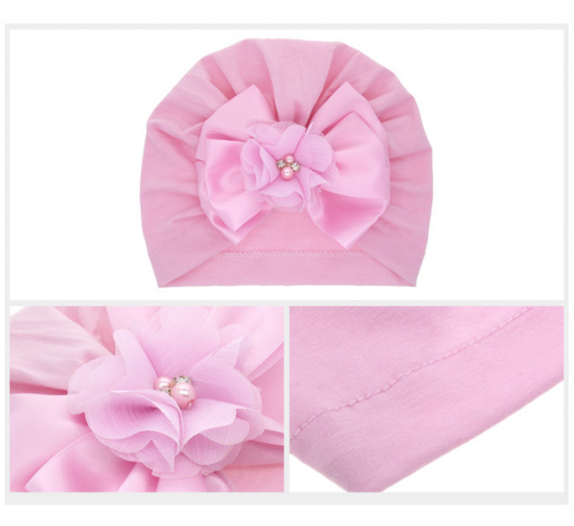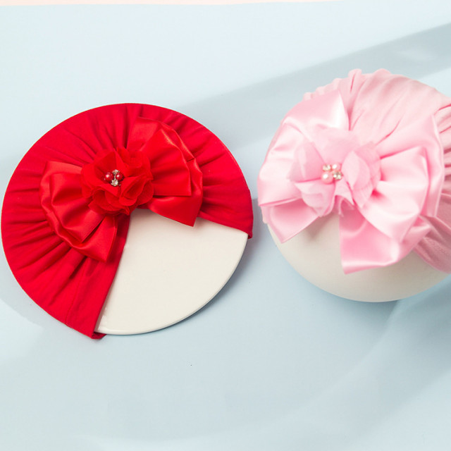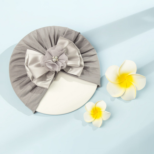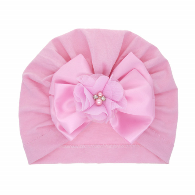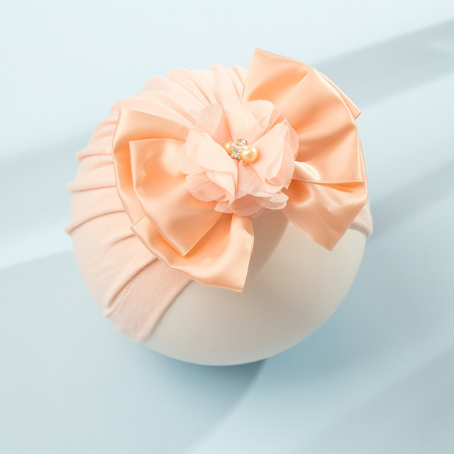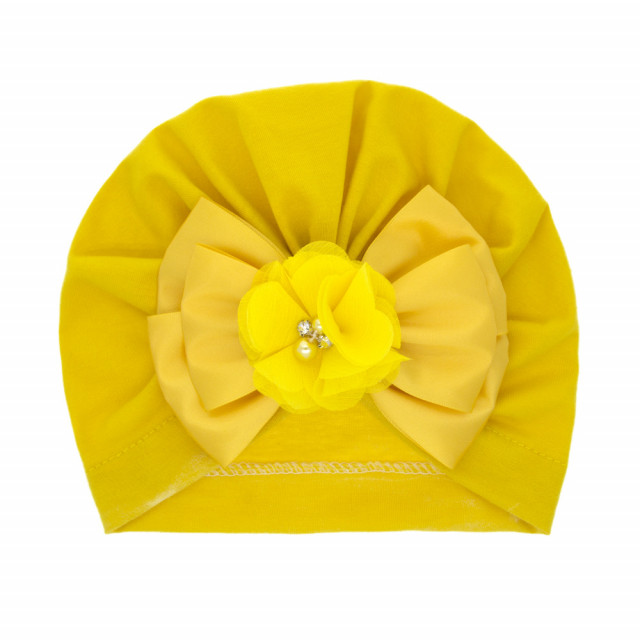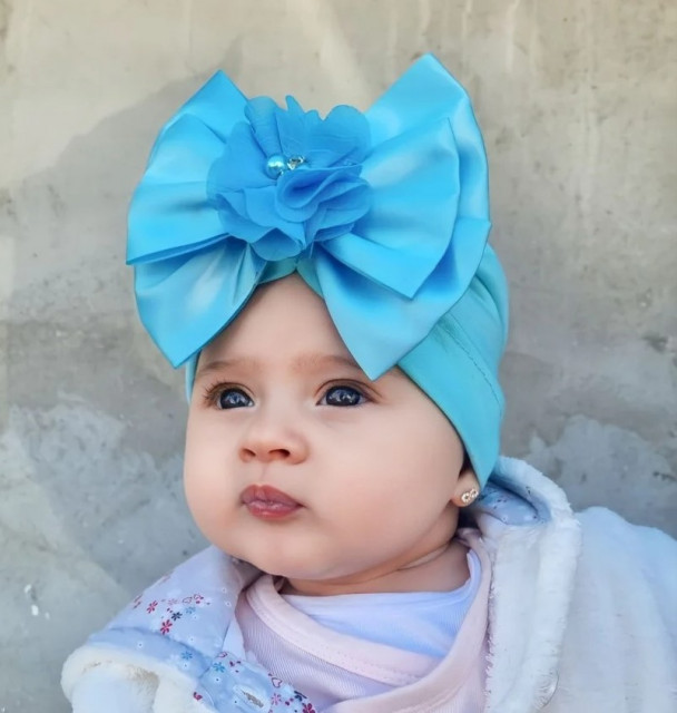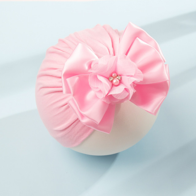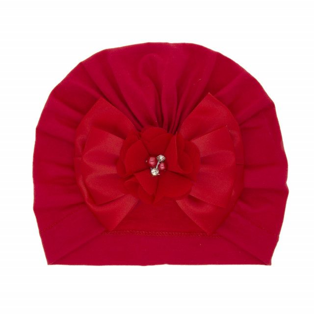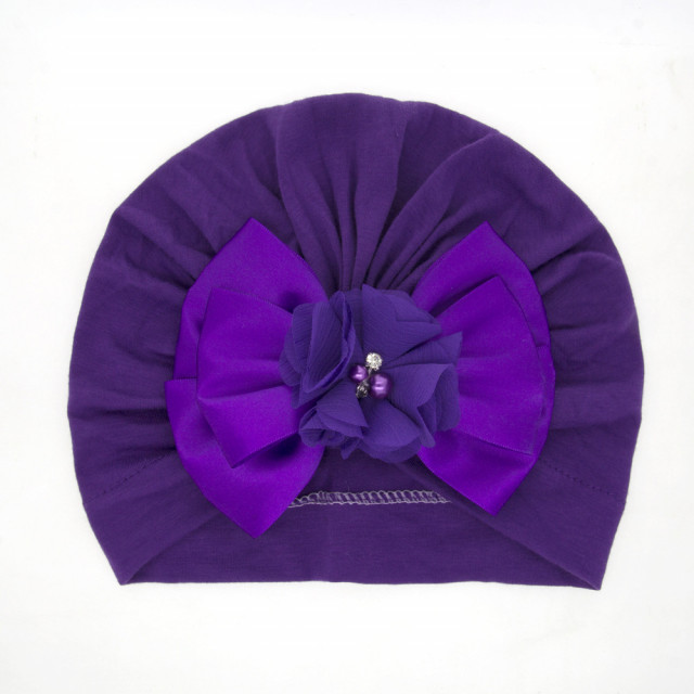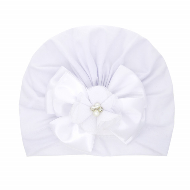 Caciulita tip turban pentru micutele domnisoare, cu funda din satin aplicata in fata.