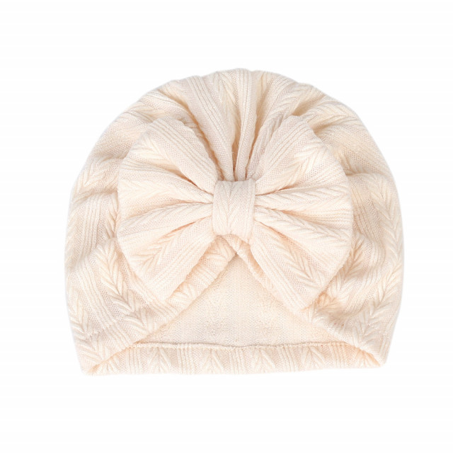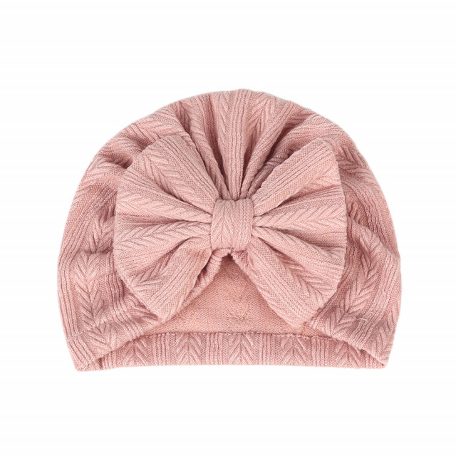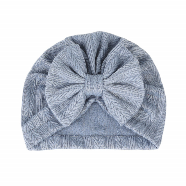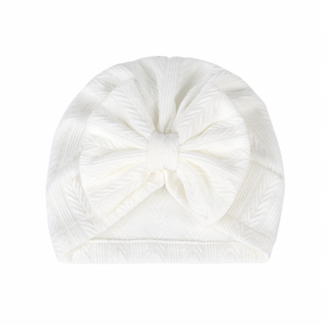 Caciulita tip turban pentru micutele domnisoare, cu model din tesatura si cu o funda aplicata in fata.