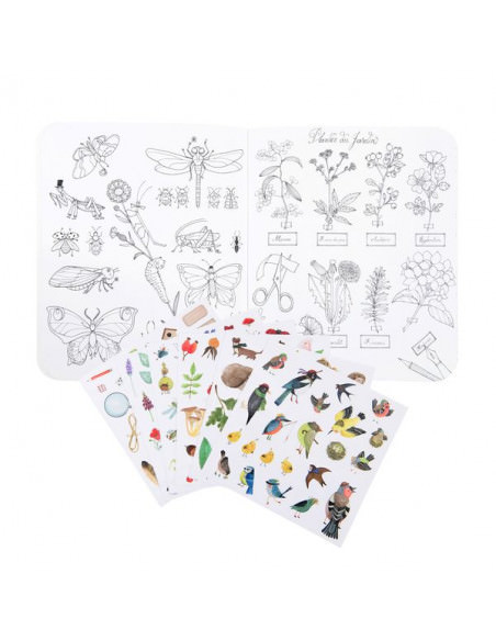 colorând grădina și completând cu autocolante cu flori, plante, animale