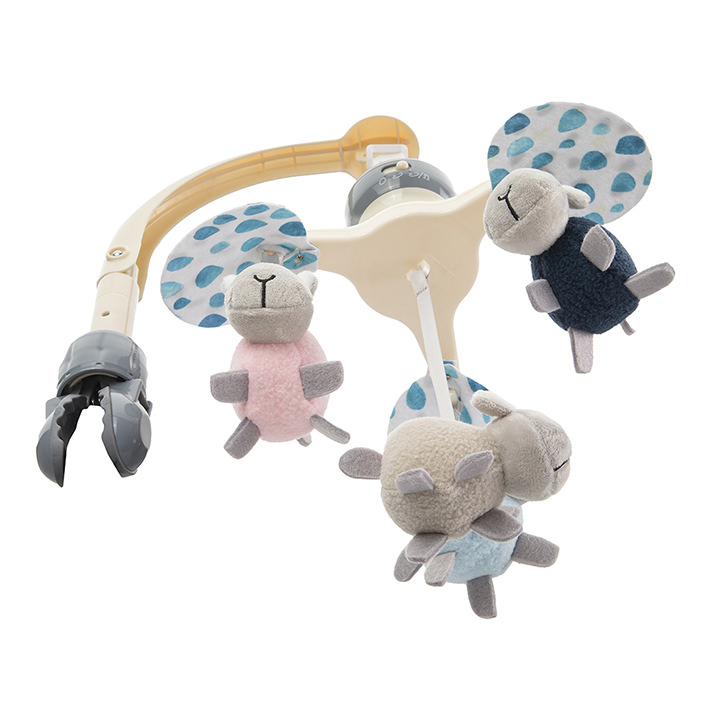 Miscarea rotative a caruselului este lenta iar cele 6 melodii, inclusiv zgomotul alb, ii vor capta atentia puiului tau.