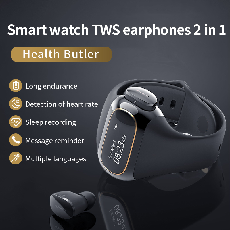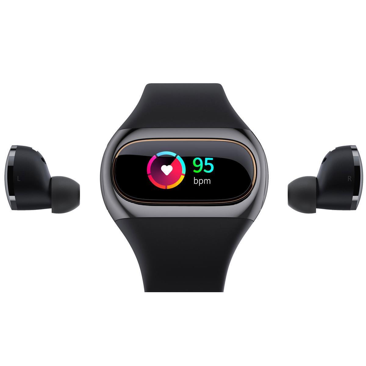Ceas inteligent Aipower pentru telefoane Android si iOS, Wearbuds 2 in 1, casti in ceas de mana, Tracker de fitness cu monitor de ritm cardiac, Ceas inteligent rezistent la apa pentru barbati si femei, AI-W20L, negru