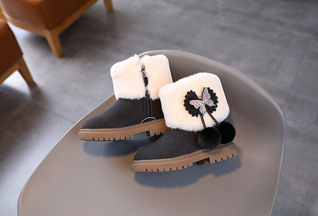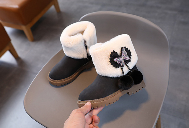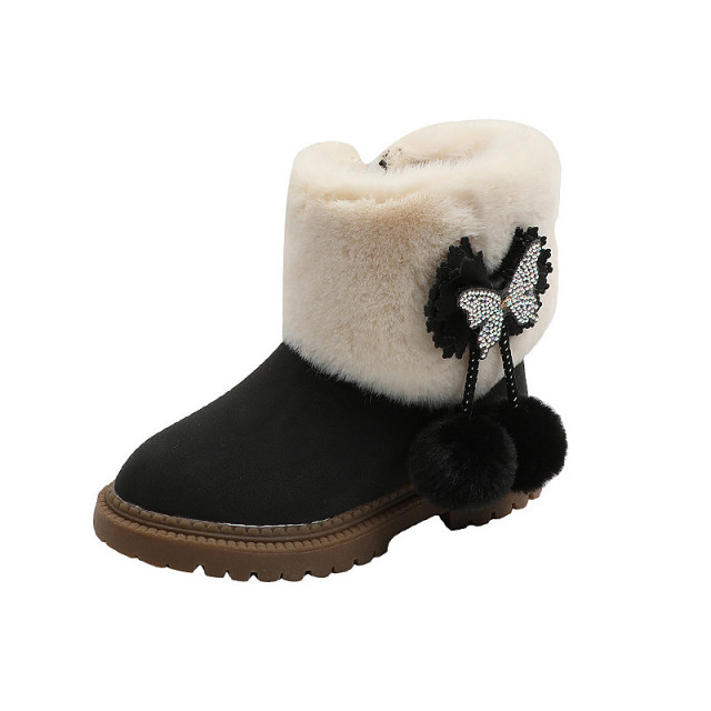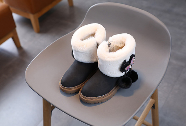 Cizme imblanite pentru fetite, din material tip piele ecologica, se inchid cu fermoar intr-o parte. Sunt prevazute cu blanita ivoire pe care este aplicat un fluturas si ciucurasi.