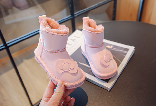 Cizme imblanite pentru fetite, din material impermeabil, cu o floricica aplicata intr-o parte.