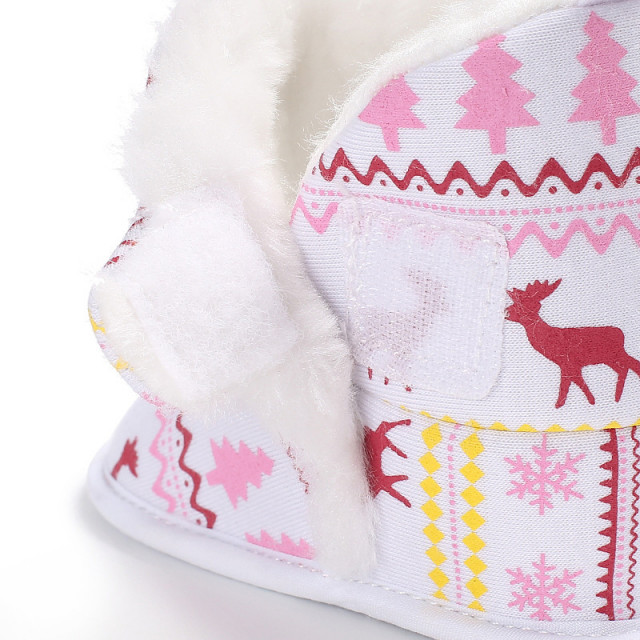 Cizmulite pentru fetite, din material textil, imbanite in interior, imprimate cu reni, fulgi de zapada si braduti Se inchid cu arici intr-o parte.