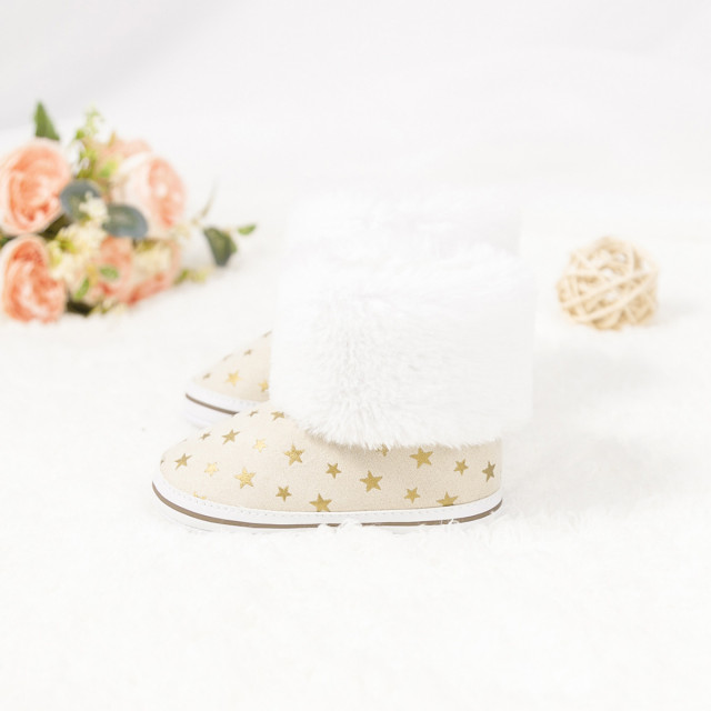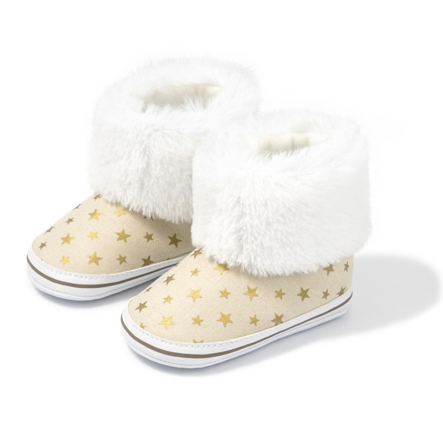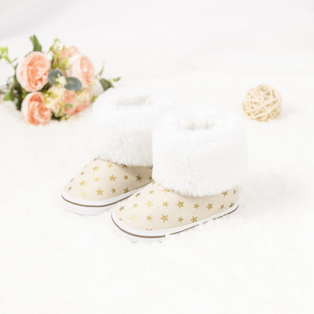 Cizmulite pentru fetite, din material textil, imprimate cu stelute aurii, cu blanita alba aplicata. Se inchid cu arici intr-o parte facilitand incaltarea cu usurinta.