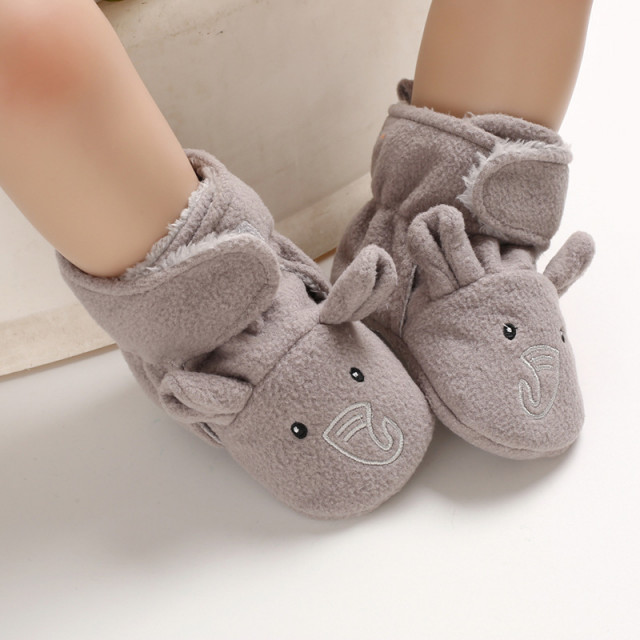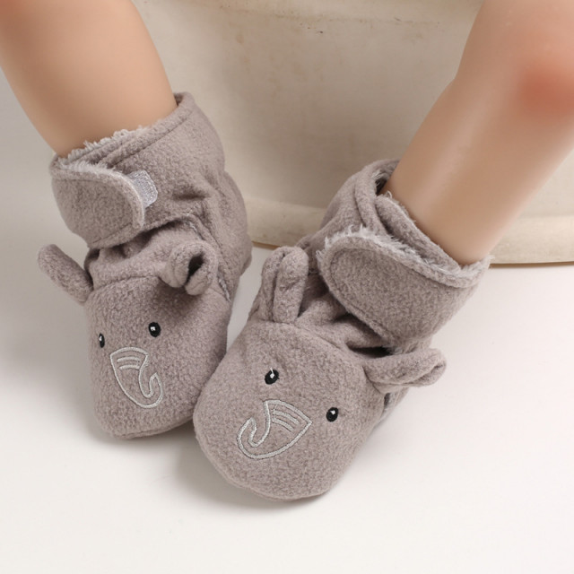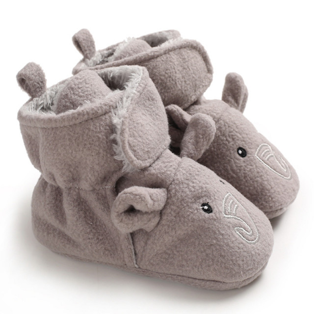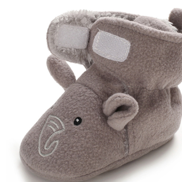 Cizmulite pentru bebelusi, din material textil plusat, imblanite, in forma de elefantel. Se inchid cu bareta lata cu arici.