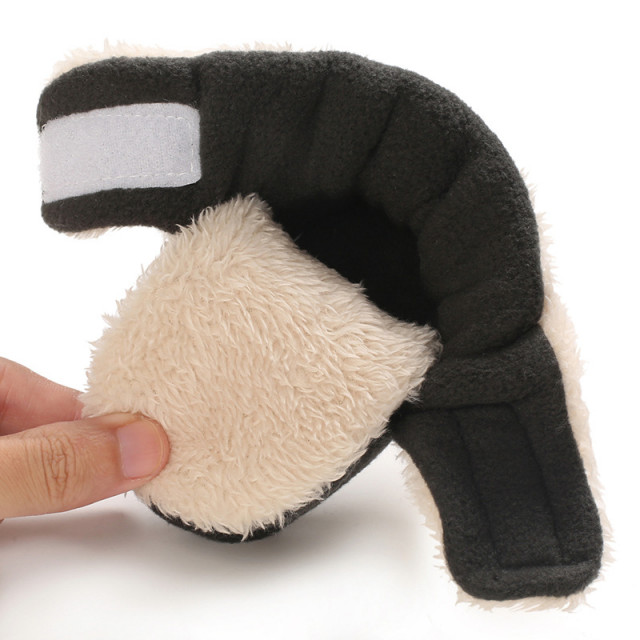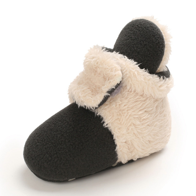 Cizmulite pentru bebelusi, din material plusat, imblanite, se inchid cu bareta lata cu arici.