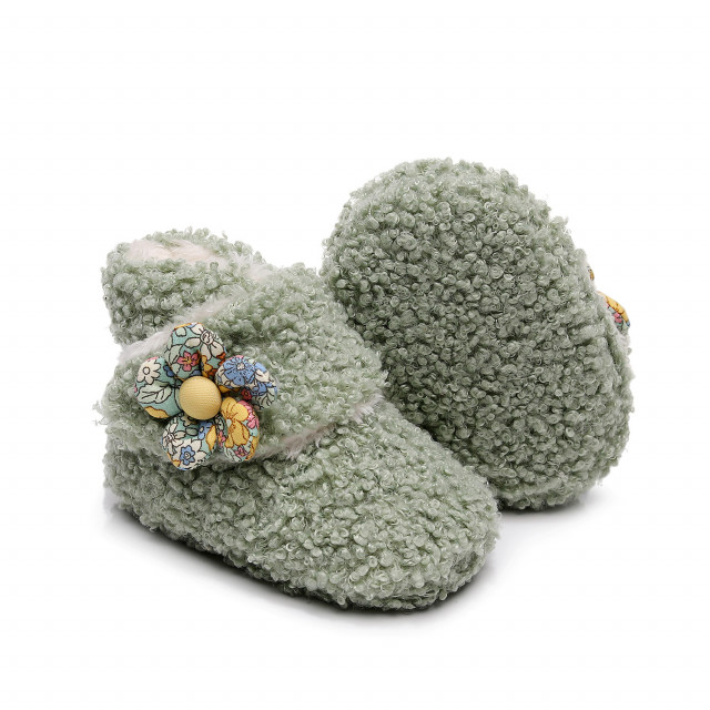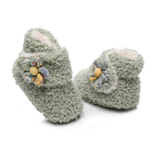 Cizmulite imblanite pentru fetite, din material textil tip blanita plusata, se inchid cu bareta lata cu arici intr-o parte, pe care este aplicata o floricica.