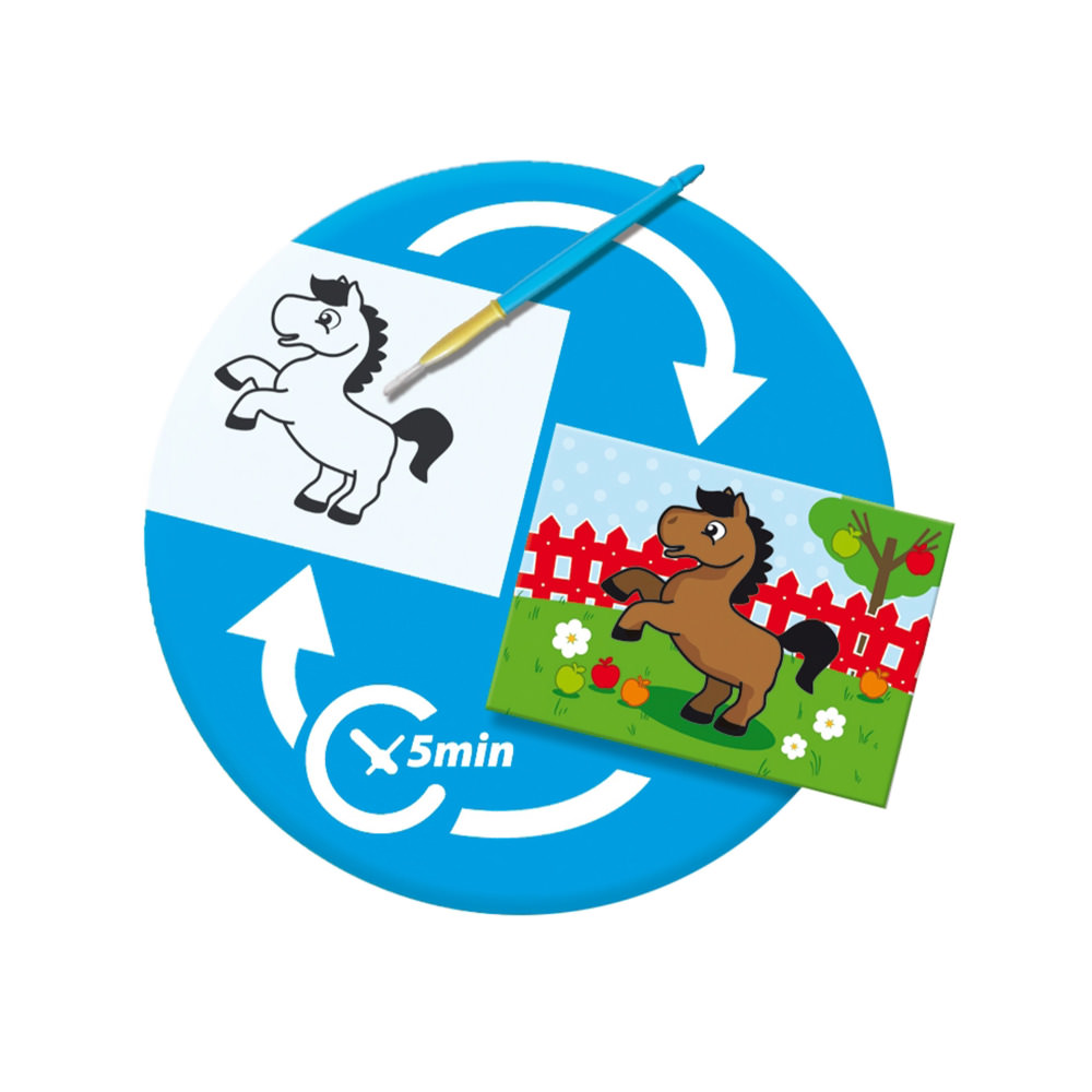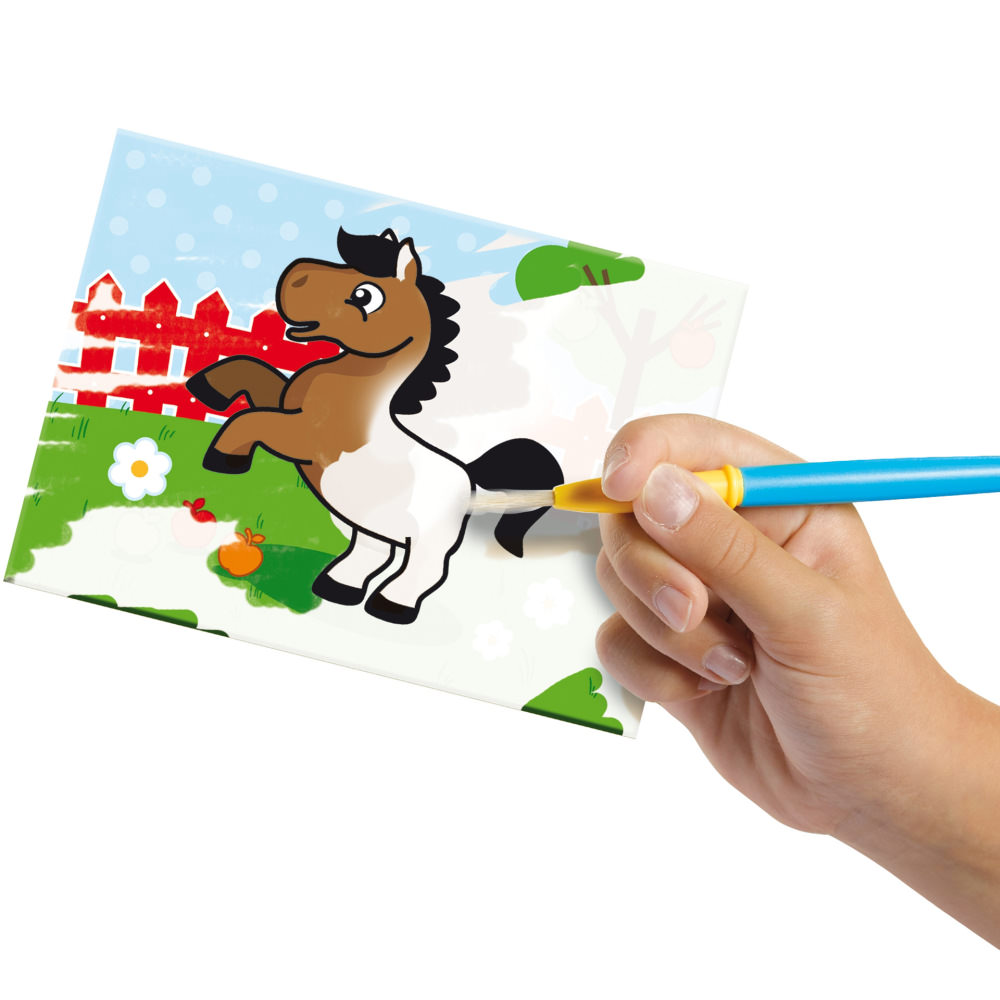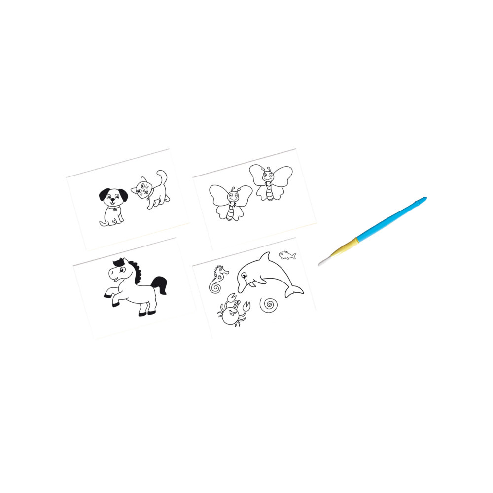 Magie cu apa si acuarele fara mizerie! Picteaza cardul cu o pensula umeda si urmareste imaginea color cum prinde viata. Pensula este sigura de utilizat deoarece firele de par nu pot cadea. Reutilizabila dupa uscare.