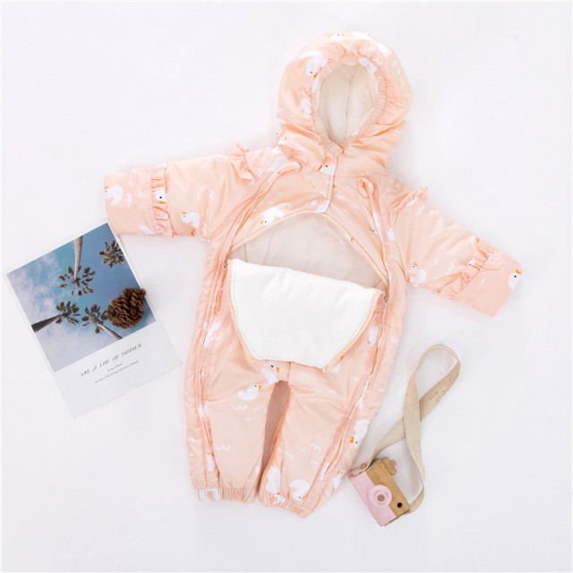 Combinezon pentru bebelusi, din fas, captusit, cu gluga, imprimat cu ratuste albe. Se inchide cu fermoar pe laterale, facilitand imbracarea cu usurinta.
