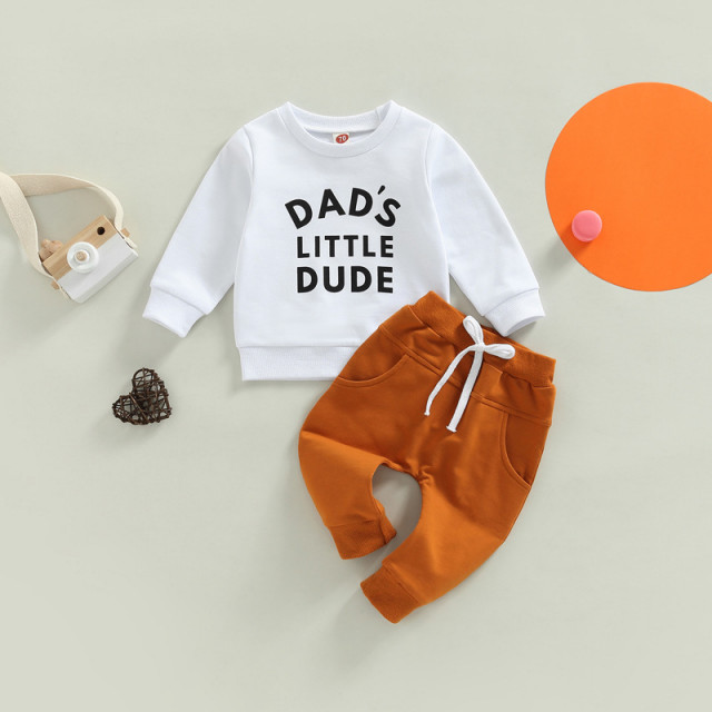 Compleu pentru baietei, format din bluza alba cu inscriptie "Dad's little dude" pe piept si pantalonasi caramizii, prevazuti cu banda elastica in talie.
