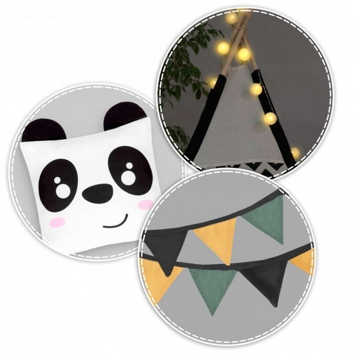 Cort de joaca pentru copii cu ghirlanda, lumini si 2 pernite nukido 120 x 120 x 160 cm - panda