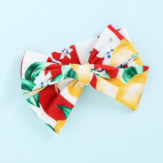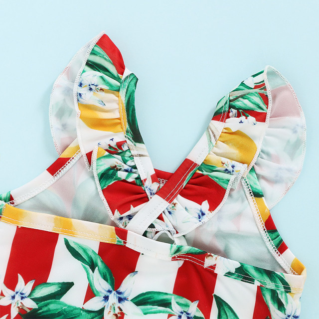 Costum de baie dintr-o singura piesa pentru fetite, alb cu dungi rosii si cu lamai imprimate.