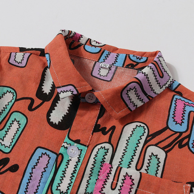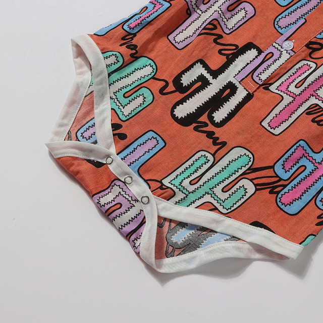 - body camasuta din material subtire tip panza topita, caramizie, cu imprimeu viu colorat, se inchide cu nasturi in fata si capse intre picioruse;