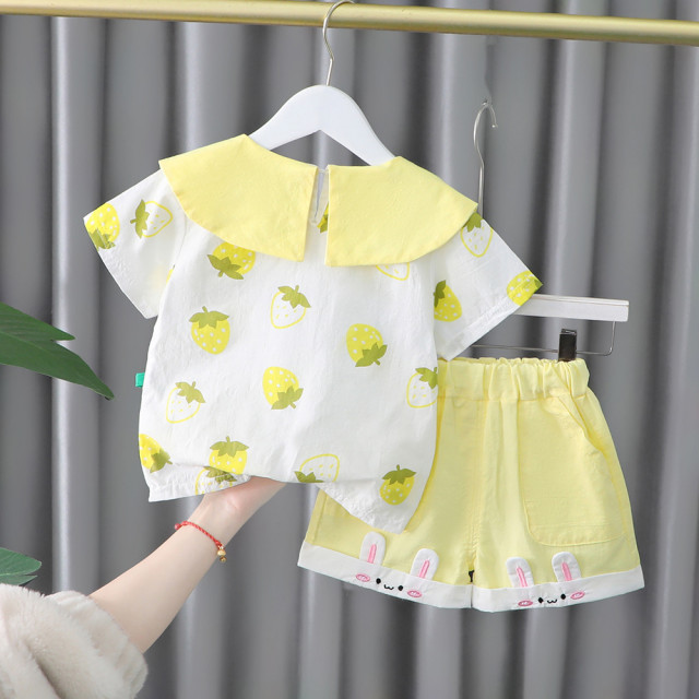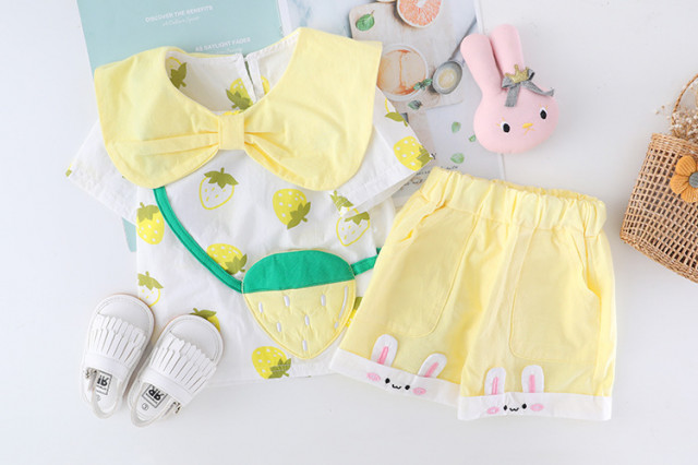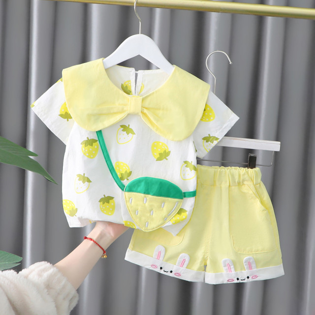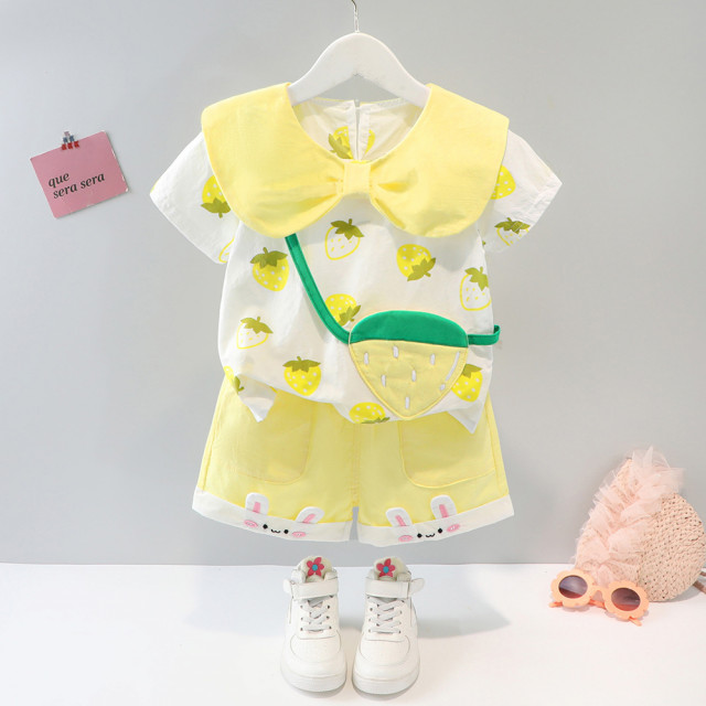 - bluzita alba cu manecute scurte, cu guleras galben in forma de fundita, imprimata cu capsunele si prevazuta cu un buzunar in forma de capsunica;