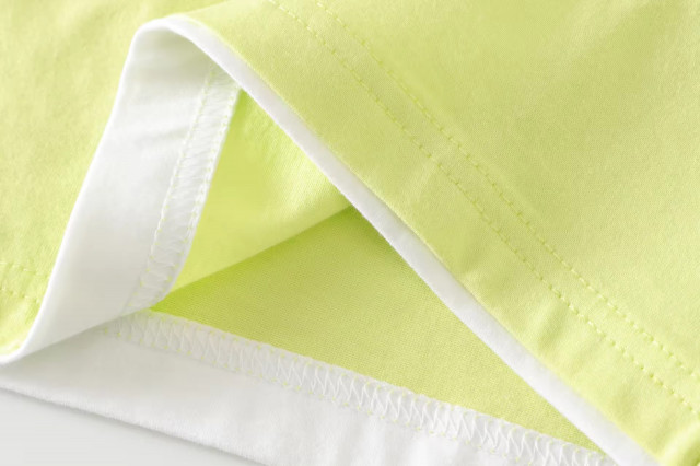 Costumas pentru baietei, cu tricou verde cu imprimeu colorat si cu pantalonasi scurti in carouri albastre, prevazuti cu buzunare si elastic in talie.