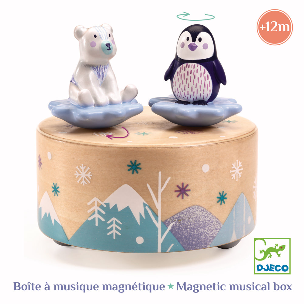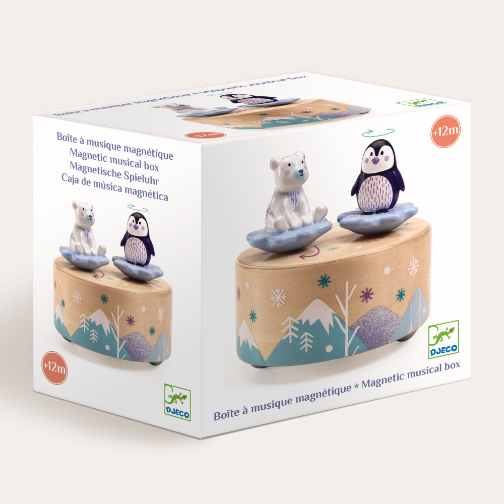 Parcul de gheață, cutie muzicală rotundă cu magneți, ilustrată frumos, cu două figurine simpatice - un urs polar și un pinguin. Doar răsuciți cheia și figurinele încep să se rotească și să danseze pe sunetul „Simfoniei jucăriilor” a lui Wolfgang Amadeus Mozart.