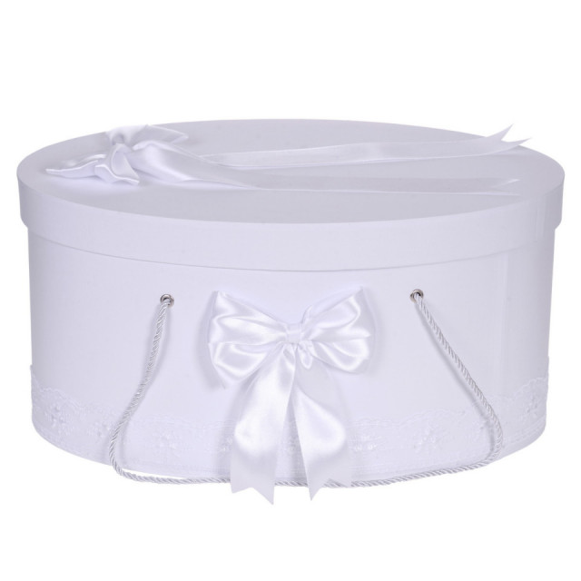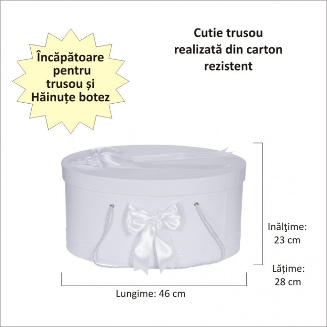Cutie de trusou botez decorata elegant cu dantela alba si fundite asortate. Cutia este ideala pentru transportul hainutelor de botez si a trusoului de botez necesar la biserica.