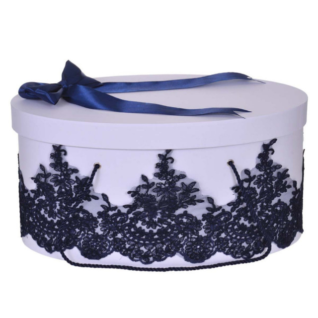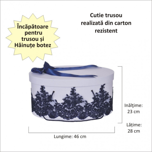 Cutie de trusou botez decorata elegant cu o dantela lata bleumarin si o fundita asortata. Cutia este ideala pentru transportul hainutelor de botez si a trusoului de botez necesar la biserica.