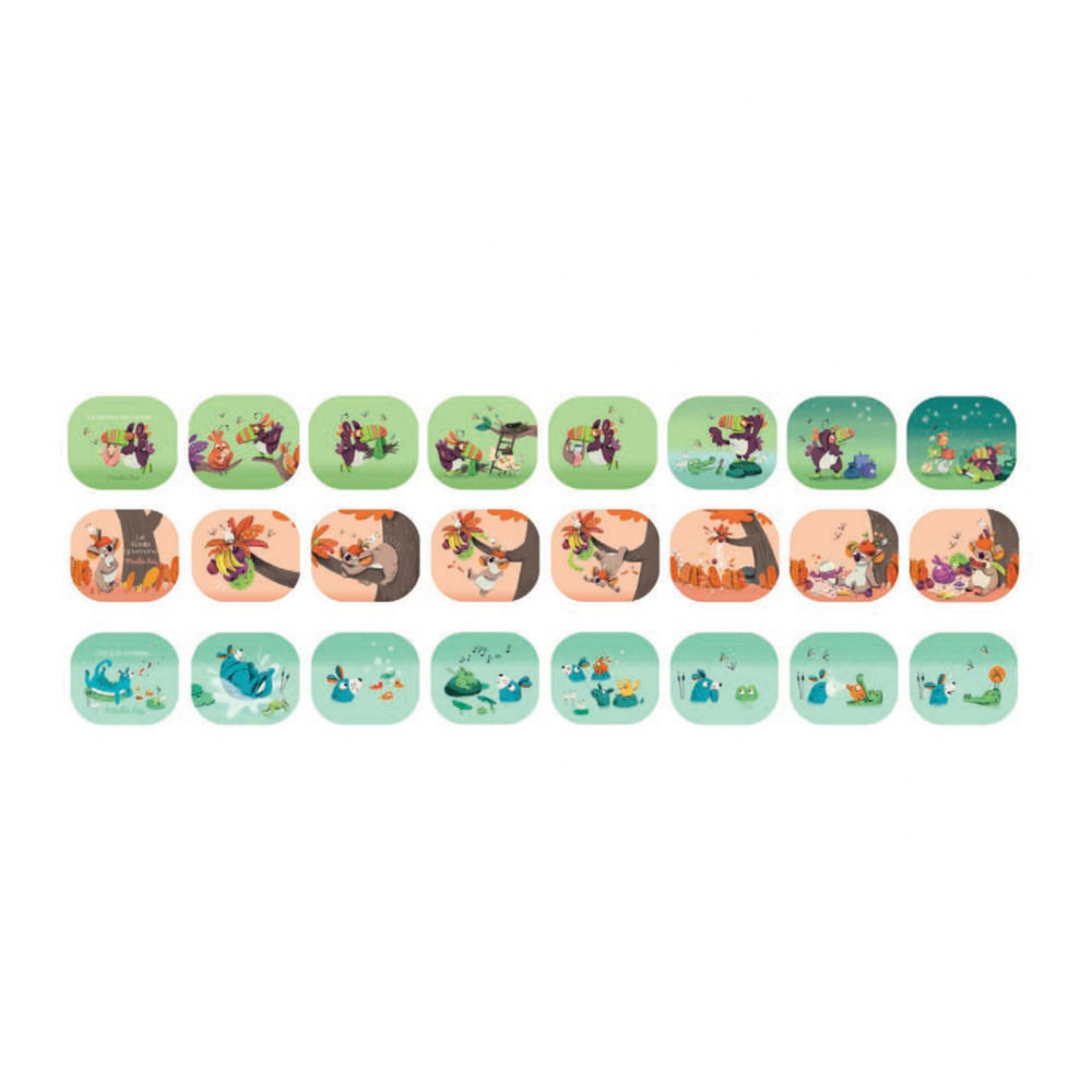 Setul conţine 3 discuri cu ”diapozitive” (3 poveşti cu 24 de imagini), compatibile cu orice model de lanternă Moulin Roty.