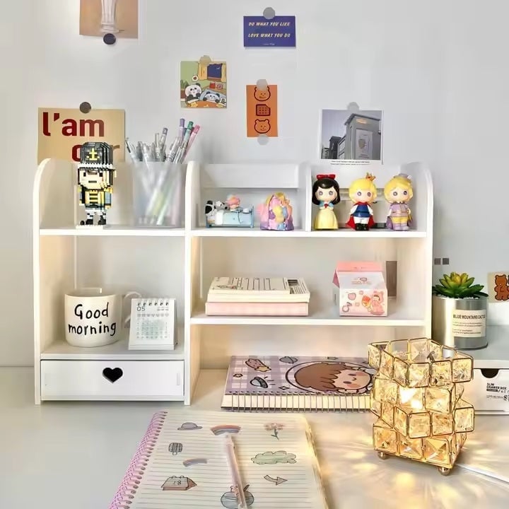 Etajera pentru birou copii, cu 6 compartimente si un sertar, pvc, 55x14x34cm, alb