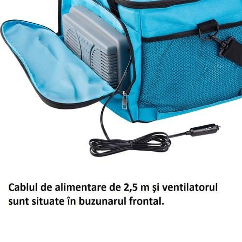 Tensiune nominală: 12 V Putere nominală de intrare: 48 W Volum interior: 30 de litri Cablu de alimentare auto la 12V : 2,5 m Capacitate: 20 sticle PET de 0,5 l sau 20 de cutii de 0,5 l Racire cu pana la 15 ° C sub temperatura normala a mediului ambiant Motor puternic si izolație de inaltă calitate cu burete gros pentru un efect mai bun de răcire Pentru alimentare la 220V este necesar adaptorul model ECG MP 2500 care poate fi achizitionat separat. Geantă practica de răcire cu buzunare suplimentare ECG AC 3010 C (30L) este echipata cu un motor puternic și o izolație de înaltă calitate, care asigură o răcire cu până la 15 ° C sub temperatura normală a mediului ambiant. Avand un volum interior de 30 de litri se pot depozita pană la 20 de sticle sau cutii de 0,5 litri. Cablul de alimentare de 2,5 m și ventilatorul sunt ascunse în buzunarul frontal. Foarte practica, datorită designului exterior din material durabil, cu o curea moale și ușoară pentru o transportare confortabilă, a interiorului detașabil și lavabil, ECG AC 3010 C este o alegere excelenta pentru calatoriile cu autoturismul vara. Datorita materialului si izolatiei din care este realizata, temperatura interioara este mentinuta pe durata alimentarii la 12V. Alte caracteristici: Cablul de alimentare este ascuns în buzunarul frontal cu fermoar Buzunar superior inteligent pentru acces ușor Curea de umăr reglabila ca lungime pentru un transport confortabil Două buzunare laterale pe exterior și două buzunare mai mici amplasate în spațiul interior pentru transportul in siguranta a produselor mici Design modern din material durabil (bumbac) Dimensiuni interioare: 36 x 25 x 28 cm (L x l x H) Dimensiuni exterioare: 43 x 34 x 28 cm (L x l x H)Descriere produs