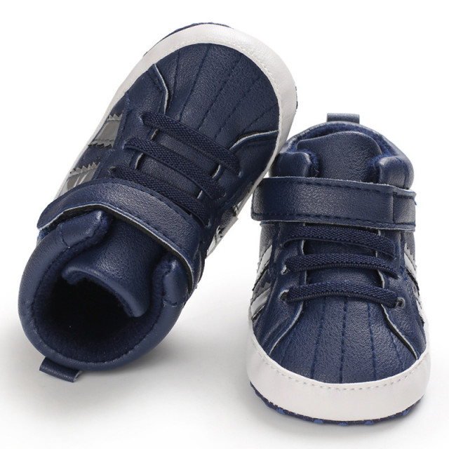 Ghetute inalte pentru bebelusi din material tip piele ecologica, prevazute cu dungi laterale, se inchid cu sireturi din elastic si bareta cu arici intr-o parte.
