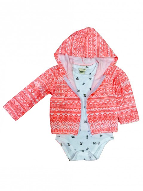 Hanorac pentru bebelusi, portocaliu neon cu alb, cu un ursulet aplicat si cu body alb cu maneca lunga imprimat cu mici maimute.